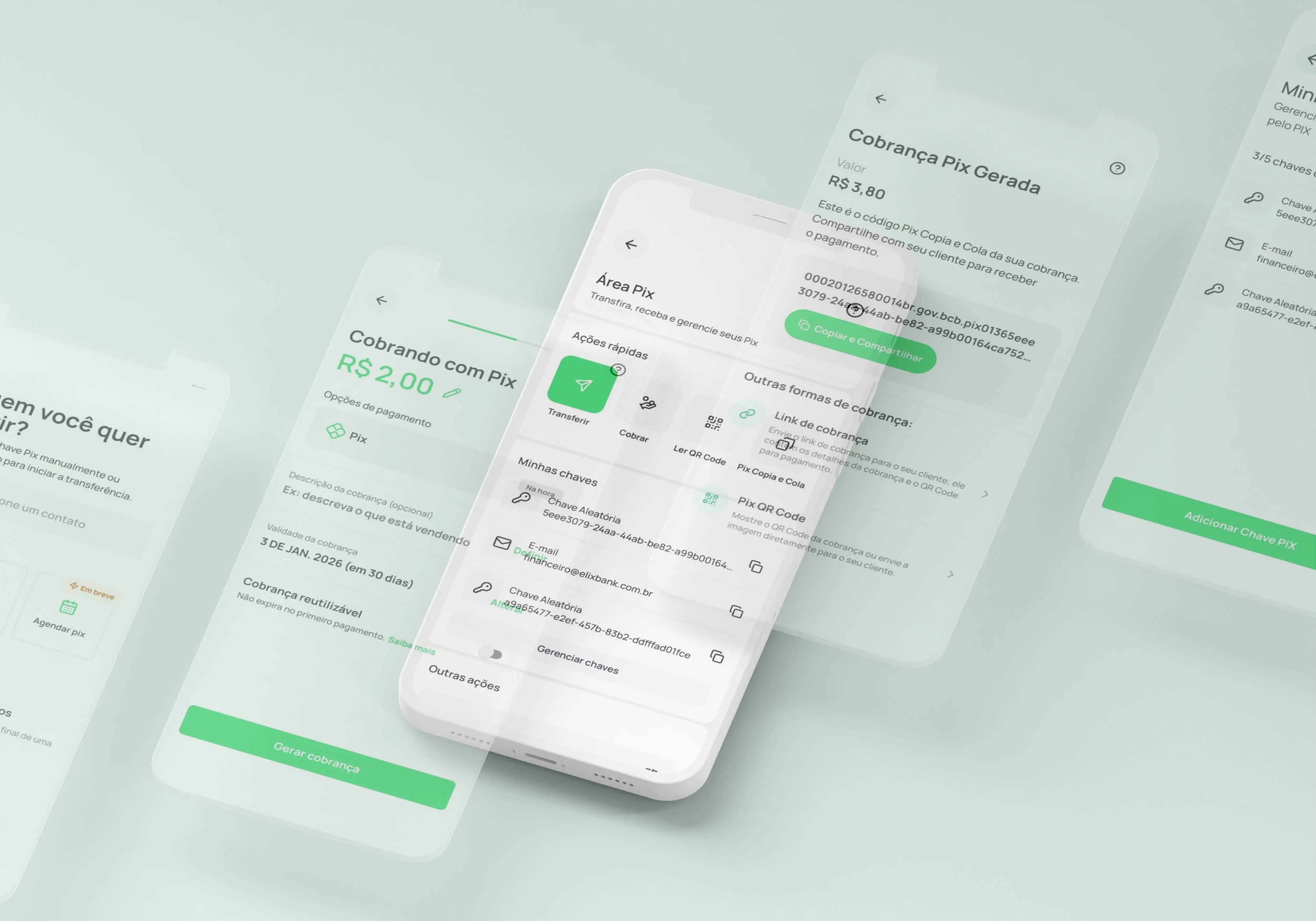 A complete Pix payments experience: send, receive, Pix Copy & Paste, scheduling, QR codes, and integration with charges and payment links for businesses.